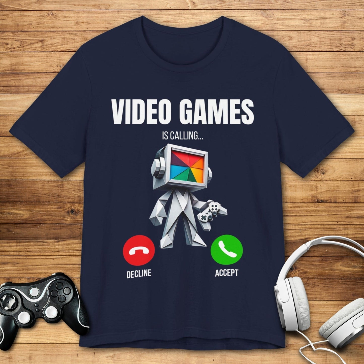 This "Incoming Call: Video Games" T-shirt is a must-have for gamers. It features the phrase "Video Games is calling..." along with a unique origami mascot that has a monitor head and clutches a controller. Below the illustration, you'll find "Decline" and "Answer" buttons, mimicking a real mobile phone's call screen, perfectly blending gaming culture with everyday tech.
