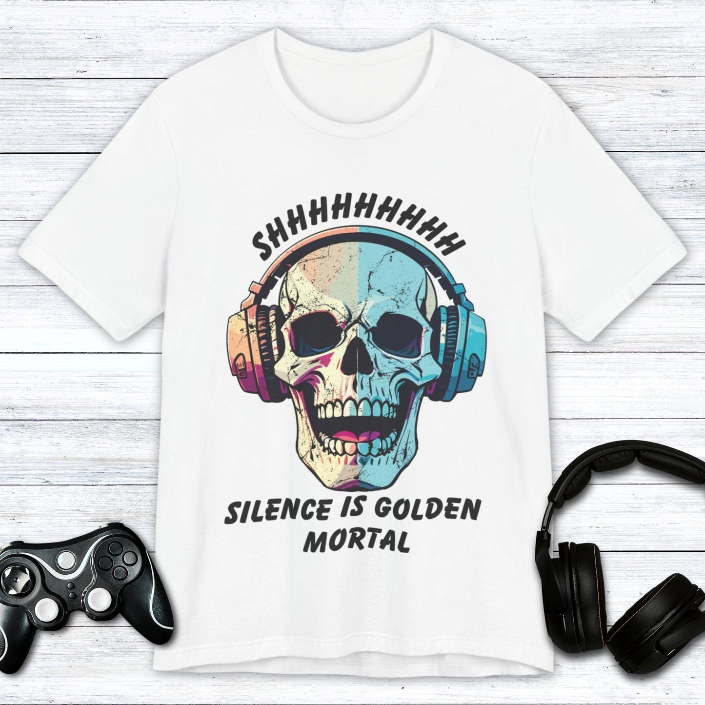 The "Silence is Golden" t-shirt illustrates a vibrant skull wearing headphones, humorously emphasizing the importance of silence. The phrase "SHHHHHHHHH Silence is Golden" encircles the skull, adding to the playful tone of the design and acknowledging those who appreciate tranquility. This shirt is an excellent choice for anyone with a witty and peaceful personality.